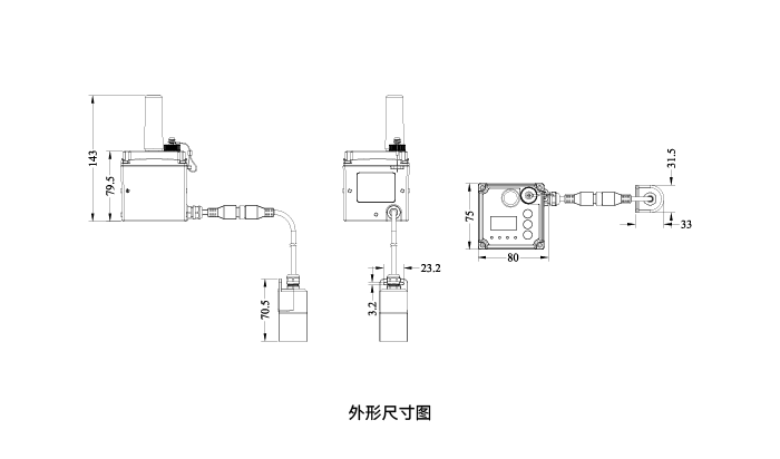外形尺寸 | 变送器:(80x75x143)mm;探头:(33x31.5x70.5)mm |